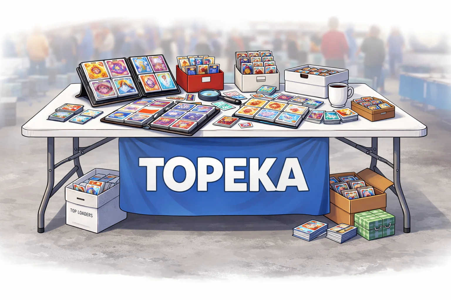 Reserve an 8’ vendor table at the Topeka Card Show, a one-day event in Topeka, Kansas at the Stormont Vail Event Center – Ag Hall, focused on sports cards, Pokémon, and TCG.