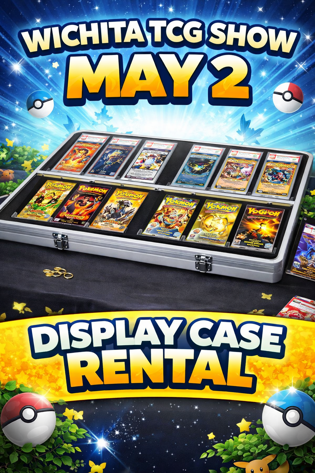 The Wichita TCG Show May 2 display case rental at the Hilton in Wichita, Kansas gives vendors a secure and professional way to showcase high-value Pokémon and TCG inventory.